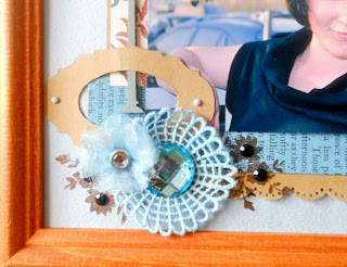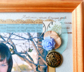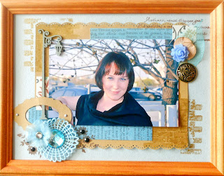Привет, привет! Сегодня я вот с такой страничкой-рамкой в подарок моей снохе. Основа - акварельная бумага (серо-голубая), подложку и рамочку я вырезала из упаковочного пакета, цветочек сделала сама. Использовала также обрезки скрапбумаги, чипборд фонарик, скелетированный листочек, розочку WP, пуговицу (ножку отпиливала долго, т.к пуговица железная), кружево, пришивной страз и штампик. Штампа с кирпичной кладкой у меня нет, поэтому я использовала кирпичную стену из игрушек моего сыночка. Покрасила игрушку бронзовой акриловой краской и сделала отпечаток...