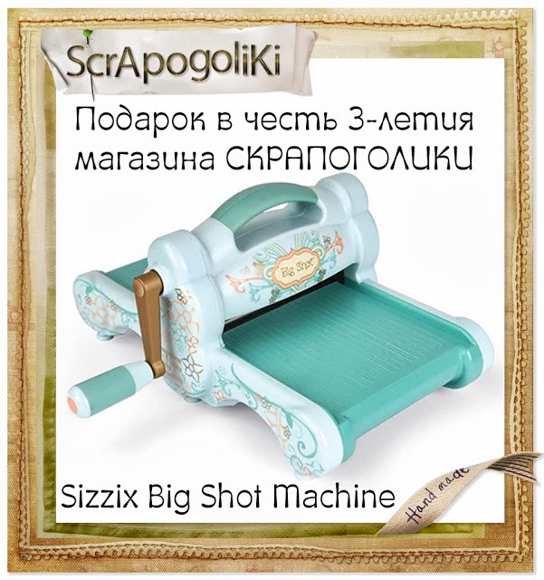 Так-с, теперь про конфетку. В честь своего 3-летия магазин Скрапоголики в блоге Скрапоголики))) разыгрывает конфетку, а вернее конфетищу - машинку для вырубки и тиснения Sizzix Big Shot Machine. Условия в блоге. Надо написать комментарий про магазин. Я писала три раза, выскакивает, что мой комментарий опубликован, но посмотреть я его, вернее их не смогла(((. Не знаю, сейчас попробую ещё раз)))). Шансов на выигрыш, конечно, маловато... но вдруг повезёт?! Очень бы хотелось))).