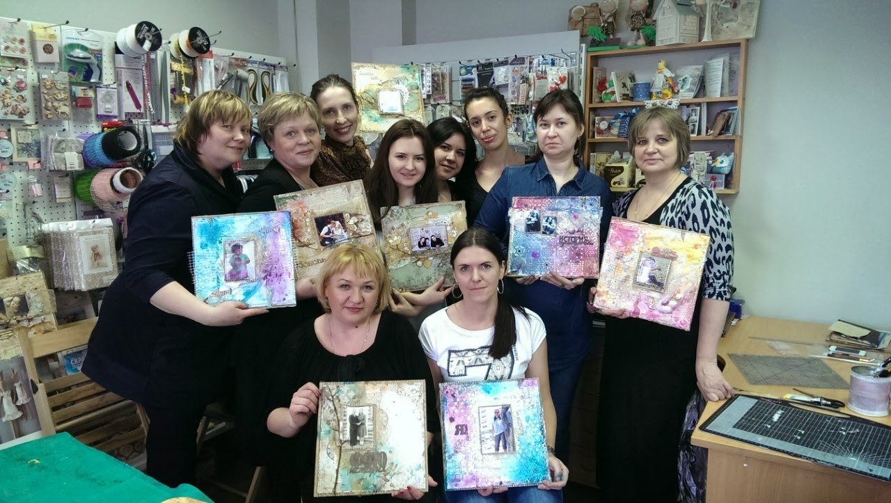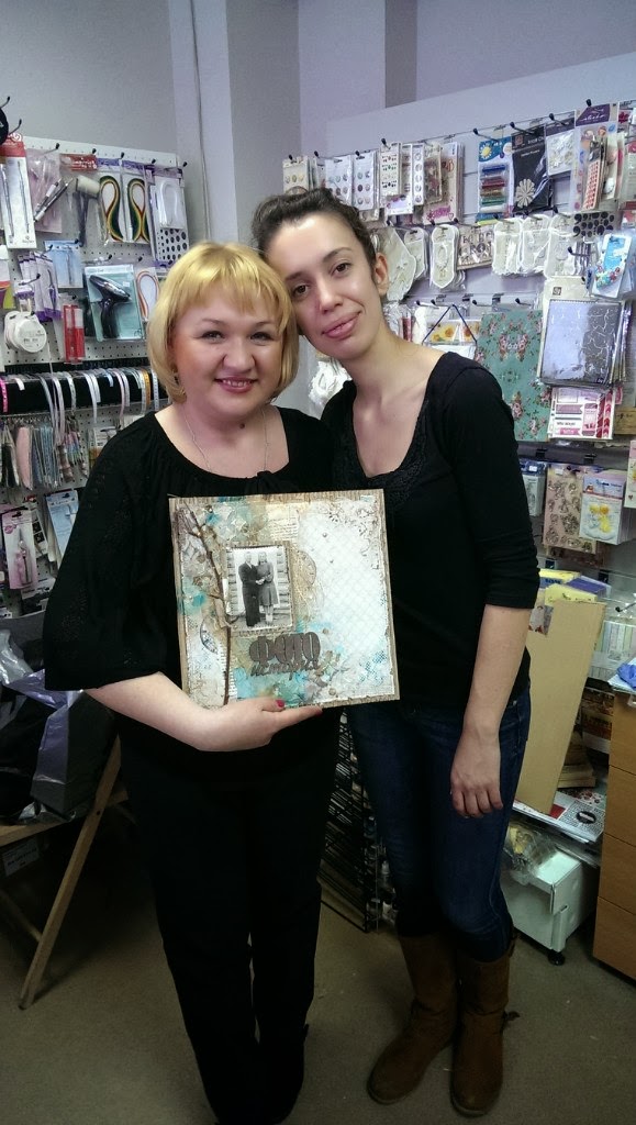 Как мне понравился МК!!! Столько красоты было сотворено в этот день!!! У нас получились две группы - одни делали странички с современными яркими цветными фотографиями, а другие, в том числе и я, с фотами черно-белыми. Очень понравилась организация МК - делали поэтапно, все всё успели. Я даже успела посмотреть работы остальных участниц. Ах, красота!!! Вика подробно все рассказывала, показывала и даже заставила меня прошить на машинке))). Теперь уж точно куплю машинку, хватить маньячить))).