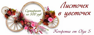 Сертификат на сумму 500 рублей в магазине "Листочек в цветочек". Загляните в магазин, там самые модные листочки и самые красивые цветочки!!!