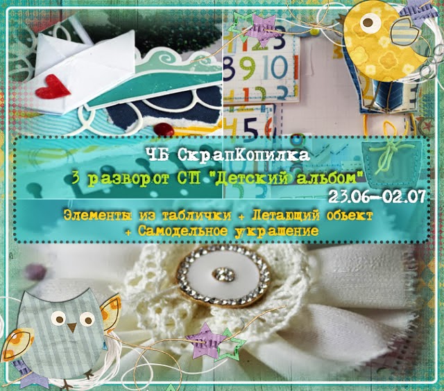 Как ваши дела? Отдыхаете? Я вот между поездками сотворила третий разворот по "Детскому альбому" со СкрапКопилкой. Второй я благополучно прогуляла). Четвертый тоже скорее всего не успею, завтра уезжаем). Вообще, конечно, времени катастрофически не хватает. К столу даже не подойти. У нас на Урале лето короткое, поэтому мы с сыном используем любую возможность позагорать и покупаться))). Плюс у нас свой дом и за лето надо успеть всё и немного больше))). Но это так, лирика. Теперь непосредственно сам разворот.